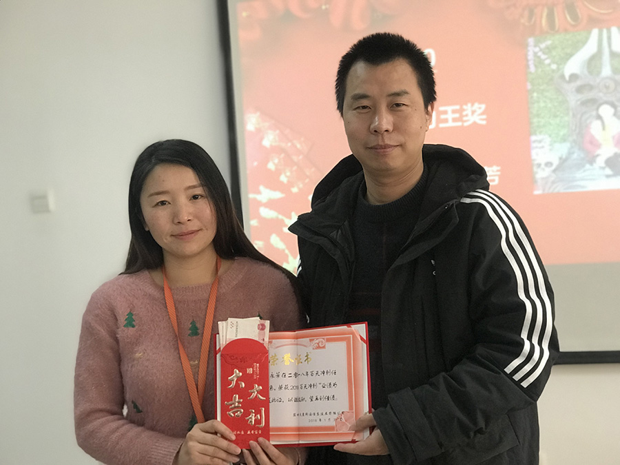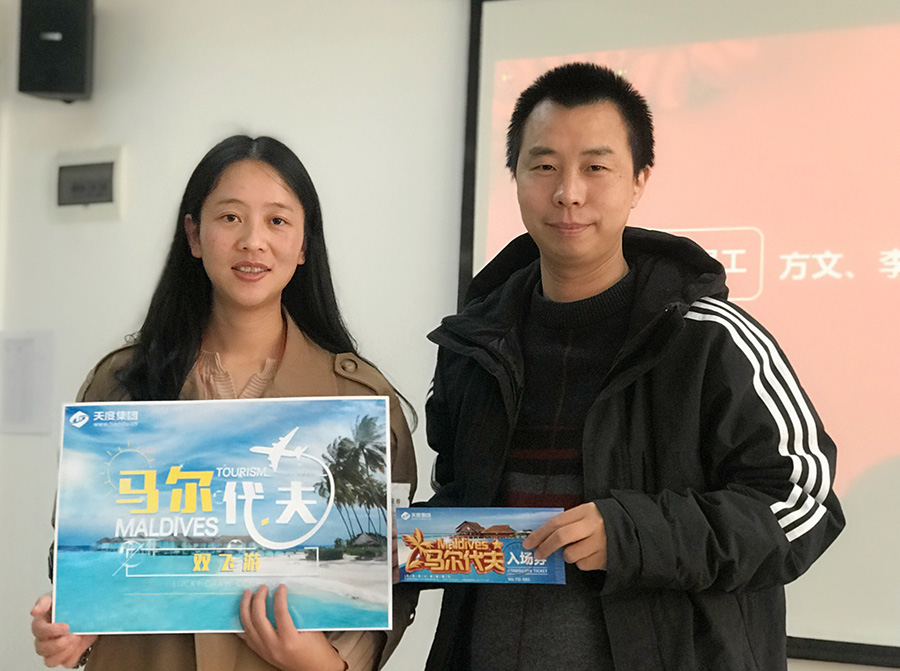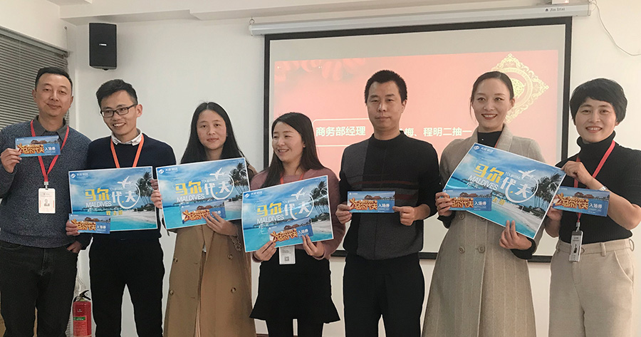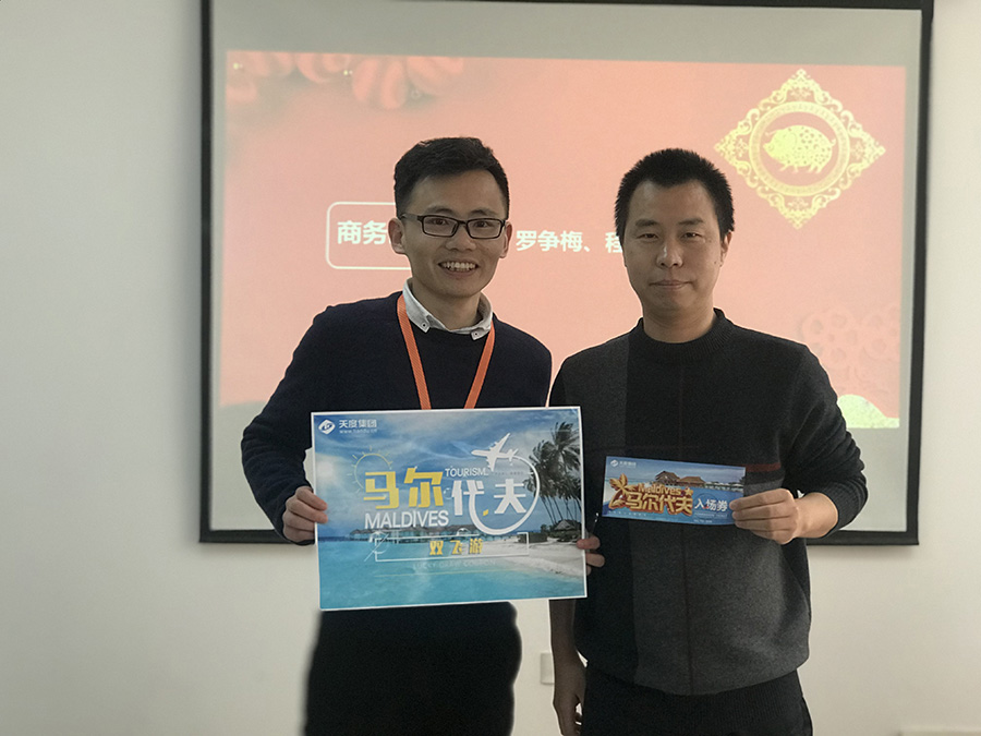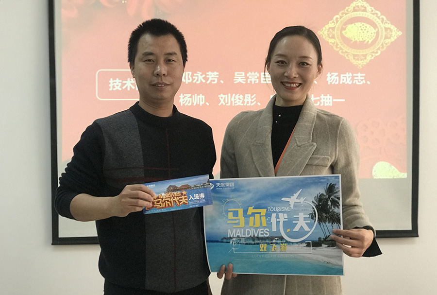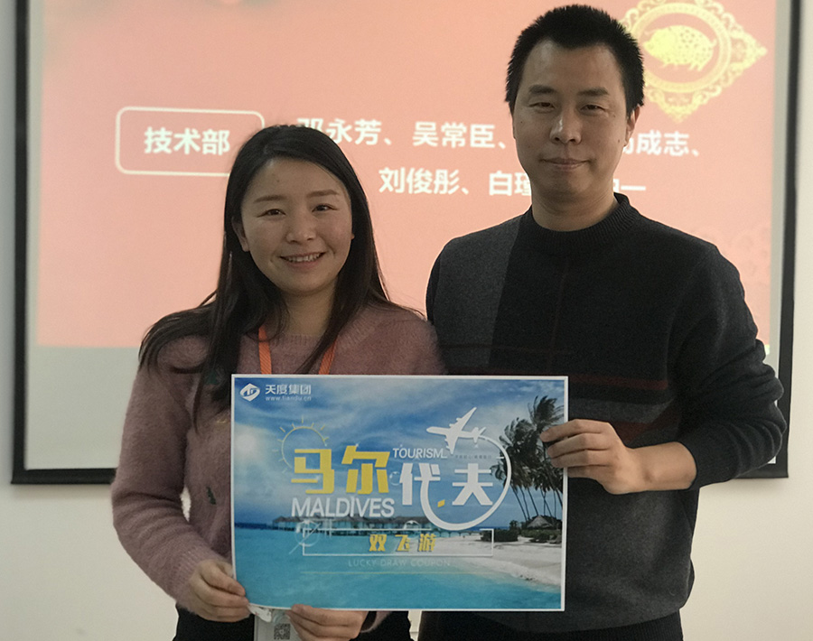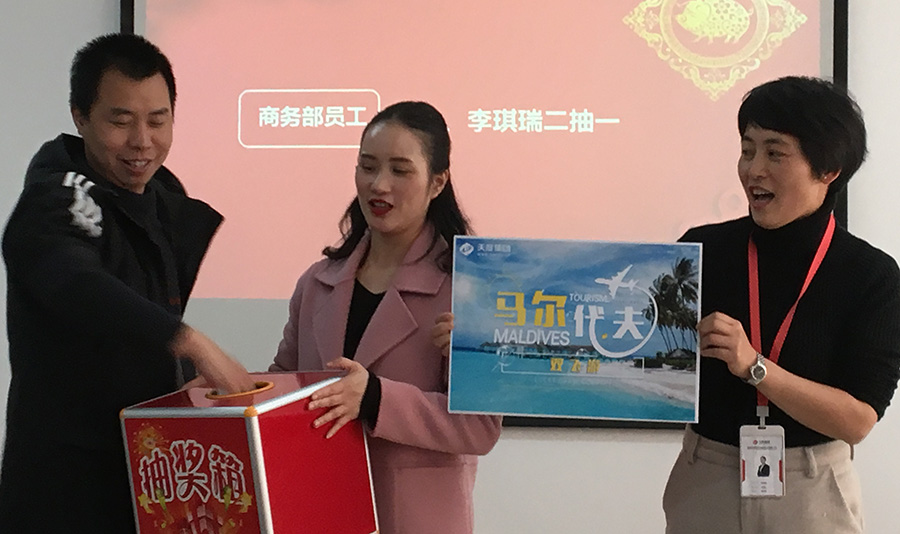 天度網(wǎng)絡(luò)公司今年拿出數(shù)十萬現(xiàn)金紅包,由楊總和陸總進(jìn)行發(fā)放(集團(tuán)每個(gè)公司的獎(jiǎng)勵(lì)和獎(jiǎng)金發(fā)放都是單獨(dú)進(jìn)行,據(jù)悉,集團(tuán)今年不管是獎(jiǎng)金總額、還是獎(jiǎng)金單額都超過往年,總額超過7位數(shù))。公司對(duì)2018年度各部門優(yōu)秀同事進(jìn)行了表彰,并發(fā)對(duì)各個(gè)獎(jiǎng)項(xiàng)進(jìn)行發(fā)放,同時(shí)鄭董事長(zhǎng)現(xiàn)場(chǎng)抽取了“馬爾代夫帶薪休假旅游”的名額。